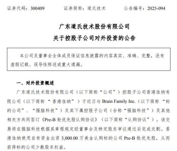 广东道氏技术股份有限公司(以下简称“道氏技术”)近日发布公告称,其控股香港佳纳有限公司(以下简称“香港佳纳”)拟以自有资金3000万美元(约合2.13亿人民币),认购强脑科技Pre-B轮优先股,从而获得强脑科技少数股东权益。