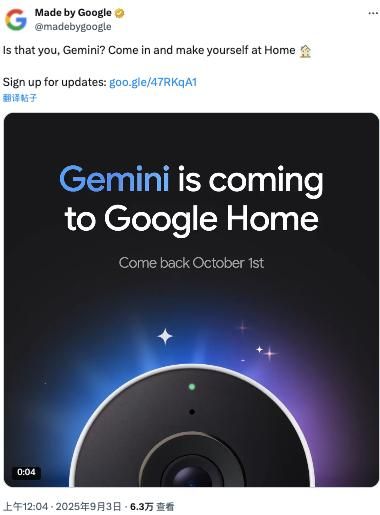 谷歌也在周三宣布,名为“Gemini for Home”的人工智能家居功能将于10月1日发布更多信息,包括为该AI助理设计的新设备。公司此前在8月底的发布会上短暂展示过这项功能,确认AI助手将取代现役的“谷歌助手”。