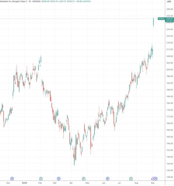 美股周三开盘后,市值超2万亿美元的庞然巨物谷歌(Alphabet)飙涨超8%。除了在Chrome浏览器反垄断案中取得绝佳裁决外,公司的AI芯片和应用方面也传出多重利好。