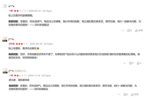 至于产品评价就不是很理想了,在这些热门评论之下,隐藏着大量真实的翻车反馈,例如“透光度、清晰度很差”、“贴上有重影,看手机会眼花”等,但几乎都是和现实效果有关的,几乎没有消费者提到防蓝光效果的事情。
