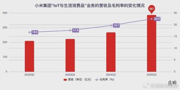 数据显示,截至2025年6月30日,小米IoT生态连接设备达9.89亿台,2025年第二季度IoT业务收入387亿(同比增44.7%),毛利率22.5%。