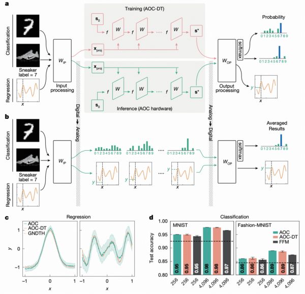 AOC 硬件结合了 3D 光学技术与模拟电子技术,并基于平衡模型实现了两个机器学习推理任务:图像分类与非线性回归。在这两项任务中,模型均通过 AOC-DT 进行数字训练,并直接部署到硬件上,无需进一步校准。这对硬件精度提出了较高要求,同时也要求 AOC-DT 具备较高的保真度。