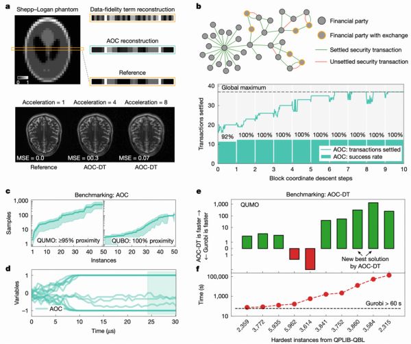 在金融领域的优化任务中,他们使用 AOC 硬件解决了一个交易结算问题。每一笔证券交易都是以支付换取证券的交换,清算所会处理这类交易的批次,在每个交易批次中,交易结算的目标是最大化已结算交易的总数或总价值。鉴于交易数量庞大,同时受到法律约束和其他附加要求的限制,这成为一项复杂的优化问题。在该交易结算场景中,AOC 硬件在 7 个块坐标下降法(BCD)步骤内找到了全局最优解。相比之下,量子硬件在相同问题上的成功率仅为 40–60%。