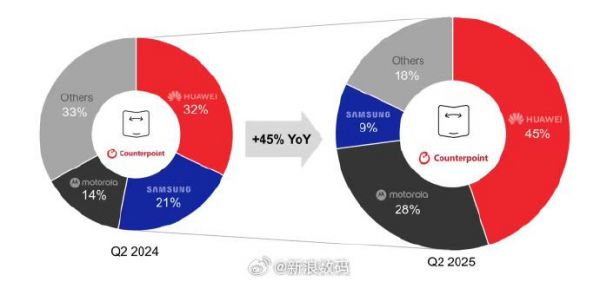 #华为夺Q2折叠手机全球出货第一#【#华为Q2折叠手机全球出货占45%#、摩托罗拉 28%、三星 9%】市场调查机构 CounterPoint Research 发布博文,报道称得益于中国持续走强和美国市场的激增,2025 年第 2 季度全球可折叠智能手机同比增长 45%。