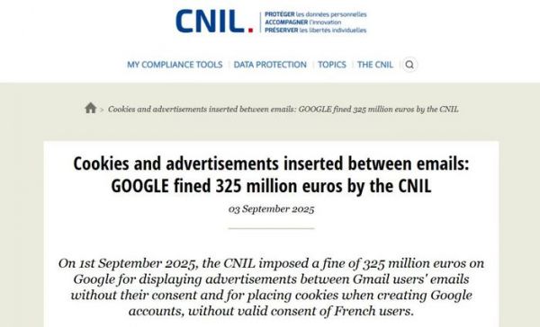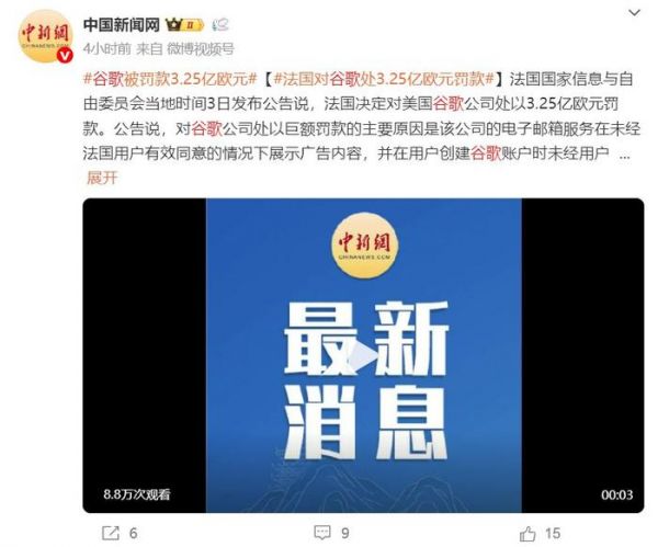 9月4日消息,据中国新闻网报道,法国国家信息与自由委员会(CNIL)发布公告称,已对美国谷歌公司作出罚款决定,罚款金额为3.25亿欧元(折合人民币约27亿元)。