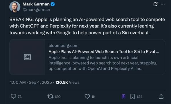 [1]https://www.bloomberg.com/news/articles/2025-09-03/apple-plans-ai-search-engine-for-siri-to-rival-openai-google-siri-talks-advance