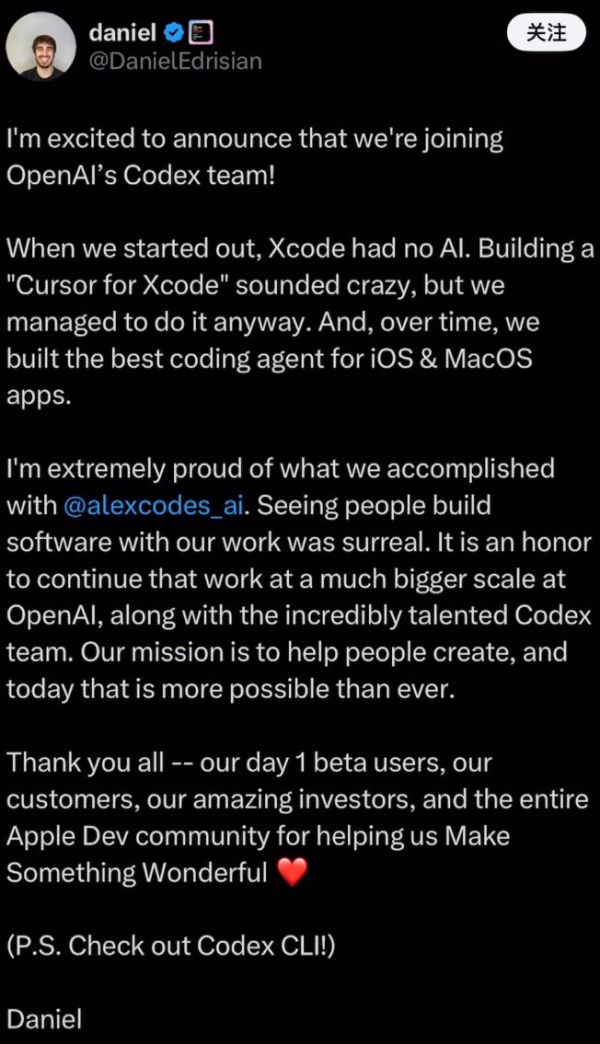就在今天,Xcode最流行的超强编程Copilot插件Alex,宣布被OpenAI收编,全员加入Codex开启新工作!这会为Codex在开发者更偏爱的Mac端的攻城略地带来哪些变数?