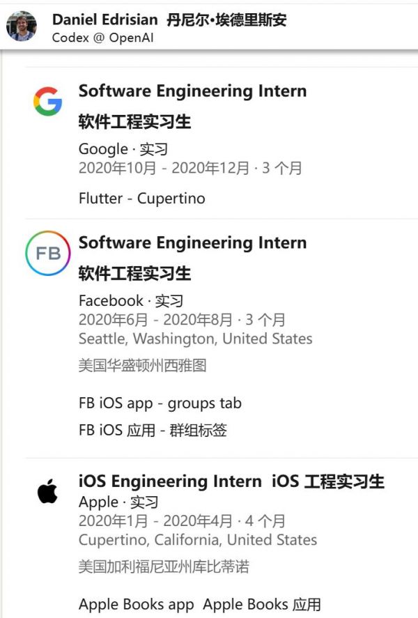大学期间,他先后在苹果、Meta、谷歌等大公司实习,专注iOS开发。
