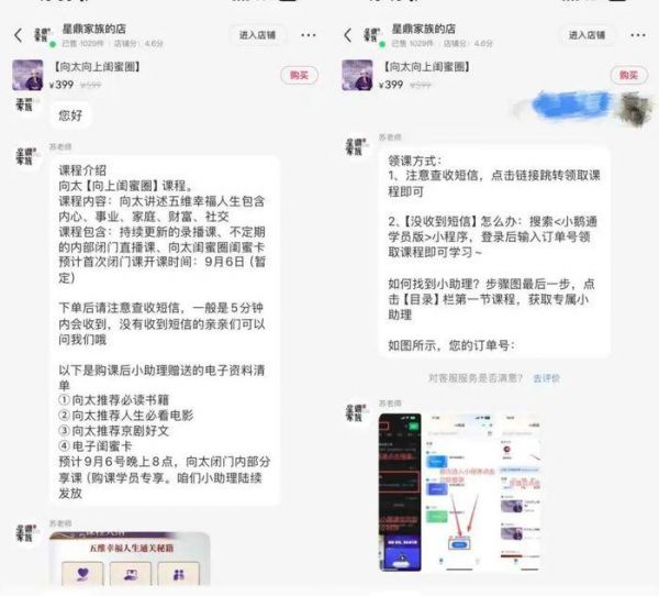《听筒Tech》发现,在向太多个平台的橱窗,可以看到售出的课程名为《向太向上闺蜜圈》,课程相关信息宣称,“体系化分享人生经验和处世哲学,带你修炼5维幸福模型”,“创始成员尊享电子向上闺蜜卡”,“全年闺蜜圈内部直播,带你创富+变美”。