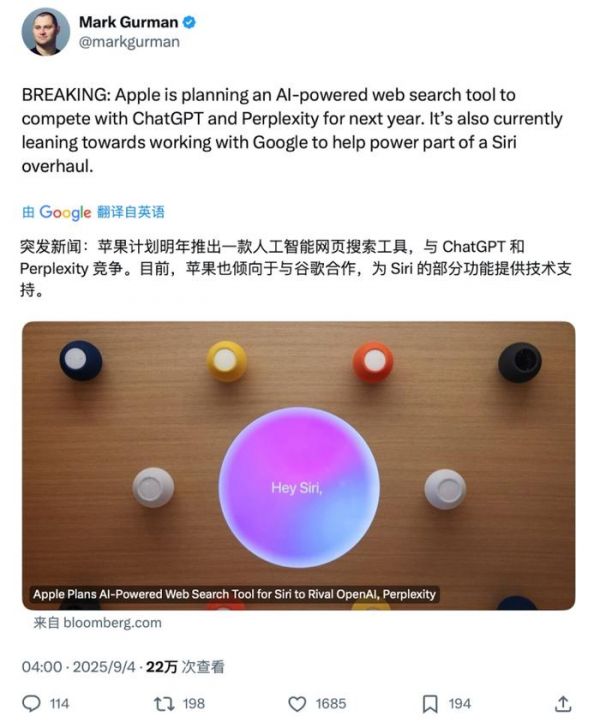 ▲马克·古尔曼(Mark Gurman)最新爆料(来源:X)据知情人士透露,这款内部代号为“世界知识问答”的新系统将集成于Siri,未来还会扩展至Safari网页浏览器及iPhone主屏搜索工具Spotlight。