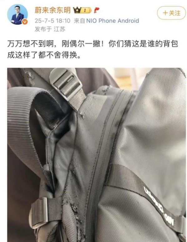 除了被网友经常拍到在机场吃麦当劳这样的快餐和使用破屏手机之外,李斌的背包也是他极度节俭的见证。不久前蔚来安徽区域经理余东明发文披露了跟随李斌多年的破损背包。有网友评论称自己扔掉的背包都比李斌的背包成色要新很多。