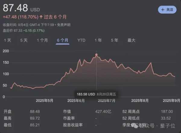 不过其Q2财报显示,由于在AI基础设施上的投入过大,其亏损进一步扩大至2.91亿美元,超出市场预期。目前股价在80-90美元之间,是开盘价的2倍以上。