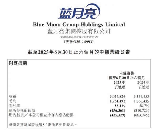 8月21日,蓝月亮集团发布2025年上半年业绩报告:营收30.37亿港元,同比略降3.0%;净亏损4.35亿港元,尽管同比收窄34.4%,但依然延续了2024年全年亏损的态势。