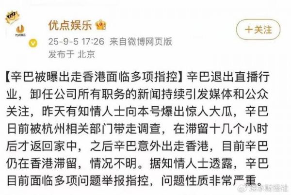 9月5日,娱乐博主“优点娱乐”爆料称,辛巴日前被杭州相关部门带走调查,滞留长达十几个小时后才返回家中。紧接着,又有消息传出,辛巴意外出走香港,目前仍在香港滞留,情况不明。