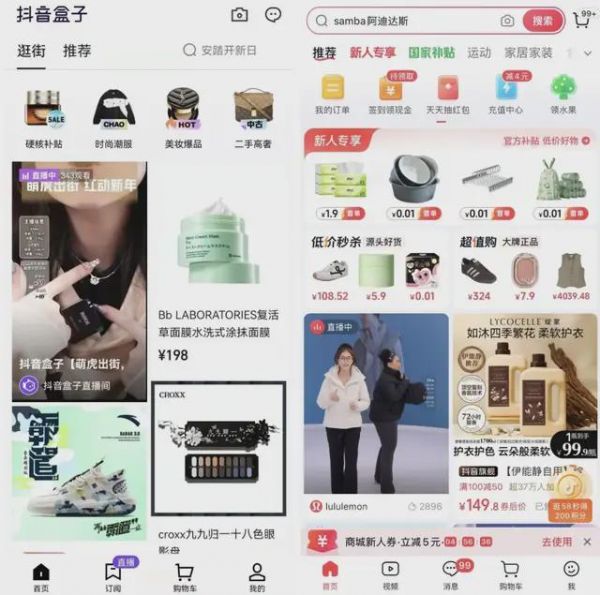 抖音盒子与抖音商城独立应用界面。抖音盒子已从应用商店下架,左图来源于网络