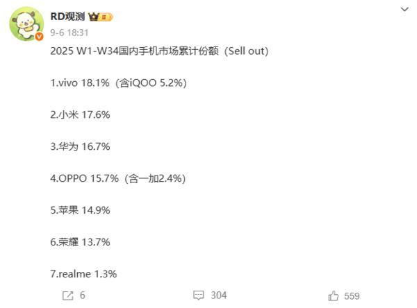 【CNMO科技消息】据数码博主发布的2025年1-34周国内市场份额榜单,vivo以18.1%的份额排名第一。其中,子品牌iQOO贡献了5.2%的份额。