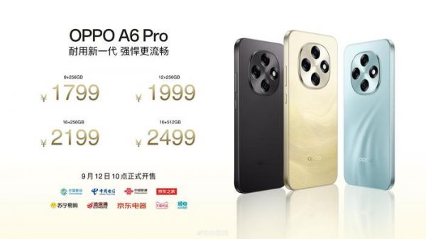 OPPO A6 Pro正式发布,是主打耐用和流畅的2000元档机型,拥有六个0流畅体验,提供金、青色、黑色三款颜色,可选四款容量组合,上市价1799元起,9月12日发售。