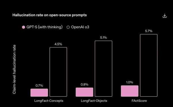 OpenAI给出的数据显示,GPT-5出现事实错误的概率比 GPT-4o 低约 45%,比 OpenAI o3 低约 80%。