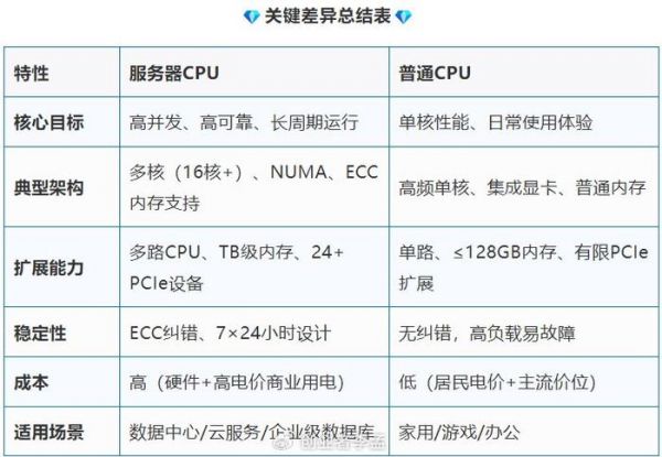 你的电脑CPU是‘短跑健将’,服务器CPU却是‘铁人三项选手’——它不追求瞬间爆发力,而要7×24小时扛住千军万马的数据洪流!想知道为什么企业机房敢收天价服务费?答案全藏在这两颗‘大脑’的设计差异里……先给概述答案,服务器CPU(如Intel Xeon、AMD EPYC系列)与普通CPU(如Intel Core、AMD Ryzen系列)在设计目标、架构特性和应用场景上存在显著差异。