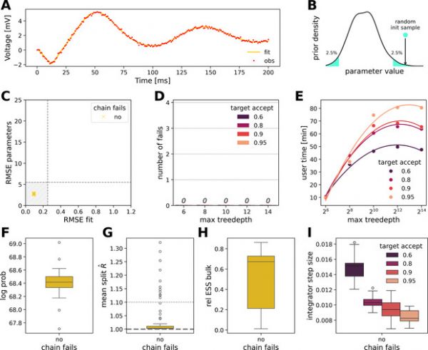 A)80条“尾部初始化”链全部拟合成功;B)初始化示意;C–D)RMSE和失败链=0;E–I)同Fig 3的诊断指标。把初始点丢到先验2.5%尾区⇒100%收敛,且探索更大胆(步长大)。先验尾部起步是一键稳收敛的简洁技巧。