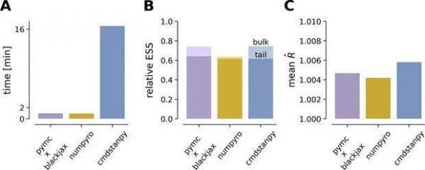 A)运行时间对比;B)ESS/抽样总量;C)平均。NumPyro≈PyMC(BlackJAX)-->比Stan快~16×。用JAX后端的PPL(NumPyro/PyMC)既快又稳,是首选实现。