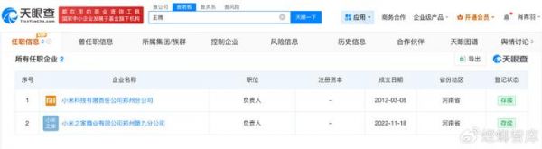 天眼查任职信息显示,王腾名下关联2家企业,分别是小米科技有限责任公司郑州分公司、小米之家商业有限公司郑州第九分公司,王腾在上述两家企业担任负责人。