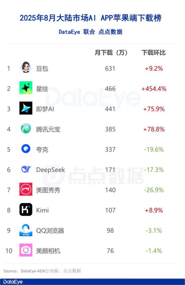 据DataEye研究院结合ADX行业版、点点数据发布的8月全球AI产品月度观察报告,字节跳动旗下的AI图片生成应用“星绘”以454.4%的下载环比涨幅位列涨幅第一,以466万的下载量位居大陆市场苹果端AI应用下载榜第二。