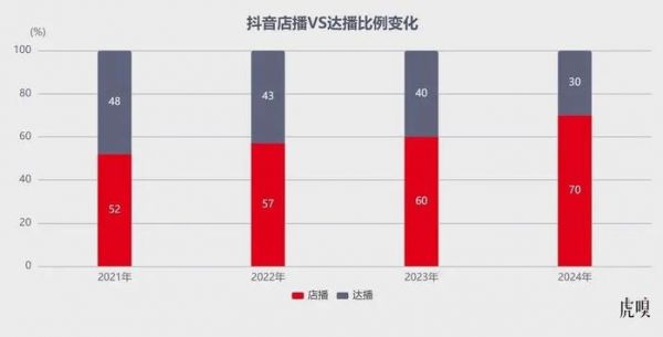 平台逐渐从依赖达人直播转向扶持店播模式。据虎嗅统计,2021年抖音大盘流量中52%为店播,48%为达播;2022年57%为店播;2023年超过60%为店播;2024年抖音电商GMV大盘中超过70%为货架场景和店播,头部达人贡献占大盘已降至9%。