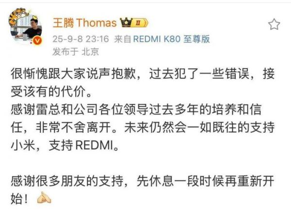 9月9日,王腾在社交网络上再次发声,称“过去犯了一些错误,接受该有的代价”,但坚称自己“没有出售公司信息、没有收钱、没有违法”。他还对雷军和公司多年来的培养表达感谢,表示“非常不舍离开”。