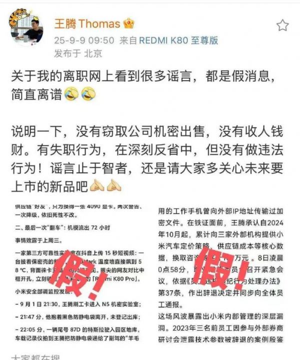 近年来,小米多次在内部强调“廉洁自律”“信息安全”。从2023年起,公司启动“廉洁风暴”专项行动,整顿内部管理,打击利益输送与信息泄露行为。王腾的“倒下”,很可能是这一整顿行动的延续。