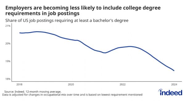 Indeed数据表明,2024年初,美国有52%的职位不再提及任何正式教育要求,而要求本科学历的职位比例也从五年前的 20.4% 下降到了 17.8%。