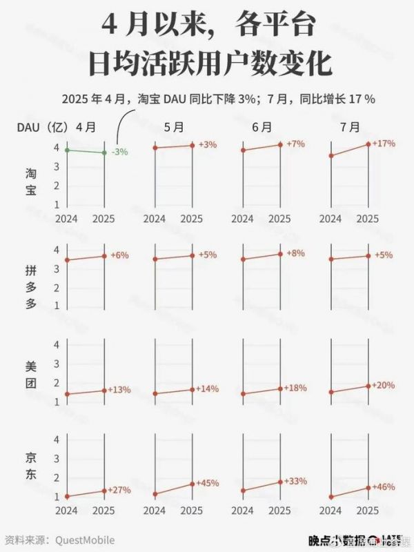 此外,8 月以来,淘宝的日活跃用户不只是周末峰值大幅上涨,且工作日也能维持在高位。8 月 8 日立秋后,淘宝闪购订单量首次超过美团。更显著的影响可能是,巨额补贴让淘宝吸引到了很多用户注意力,7 月以来淘宝在日均活跃用户数(DAU)上拉开了和拼多多的差距,超拼多多约5000万(DAU)。这也是阿里一直希望达成的目标。