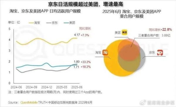 根据Quest Mobile数据,截至2025年6月,美团、淘宝、京东的APP日均活跃用户(DAU)规模分别提升18.2%,7.3%和33.2%,京东实现增速领跑。用户规模上,京东DAU达到了1.80亿,已经反超了美团的1.71亿。业内资深人士认为,“此前京东将外卖业务视为流量入口的策略已初见成效,未来通过与即时零售、本地生活、核心电商业务的协同,‘高频带低频’‘低价外卖带动高价即时零售和电商业务’的模式会持续发挥飞轮效应。”
