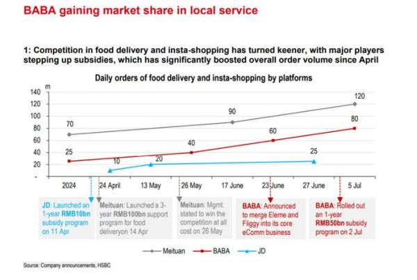 自2024年4月以来,外卖配送和即时零售竞争愈发激烈。美团在4月14日推出为期三年、总额1000亿元人民币的外卖支持计划,并在5月26日宣布“不惜一切代价赢得竞争”。京东则在4月11日启动为期一年、总额100亿元人民币的外卖补贴项目。