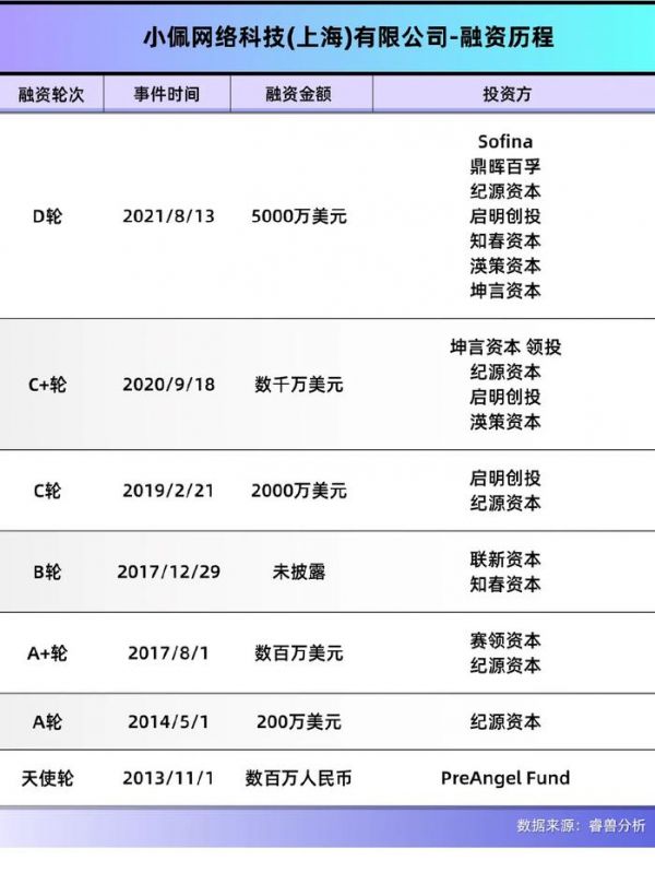 自成立以来,小佩已完成7轮融资,最新一轮是2021年8月的5000万美元D轮融资,投资方包括Sofina、鼎晖资本、纪源资本等。