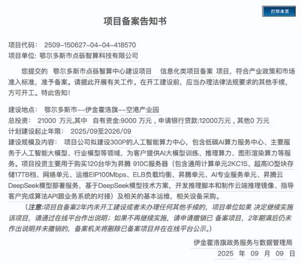 智东西9月12日消息,9月9日,鄂尔多斯市点砾智算科技有限公司提交的鄂尔多斯市点砾智算中心建设项目准予备案。该项目总投资2.1亿元,其中自有资金9000万元,申请银行贷款1.2亿元。