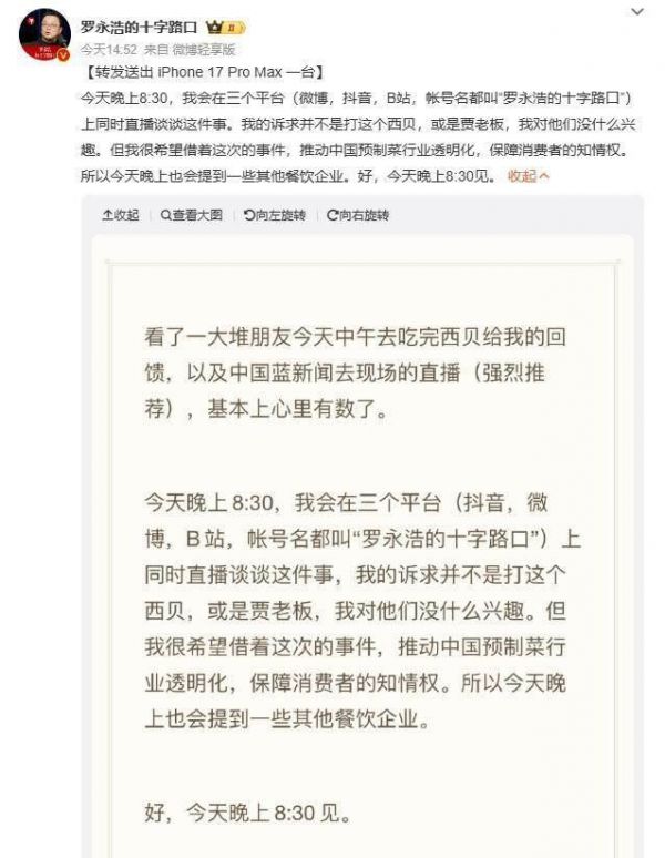 此前,罗永浩发文称:“今天晚上8:30,我会在三个平台(微博,抖音,B站,账号名都叫罗永浩的十字路口)上同时直播谈谈这件事。我的诉求并不是打这个西贝,或是贾老板,我对他们没什么兴趣。但我很希望借着这次的事件,推动中国预制菜行业透明化,保障消费者的知情权。所以今天晚上也会提到一些其他餐饮企业。”