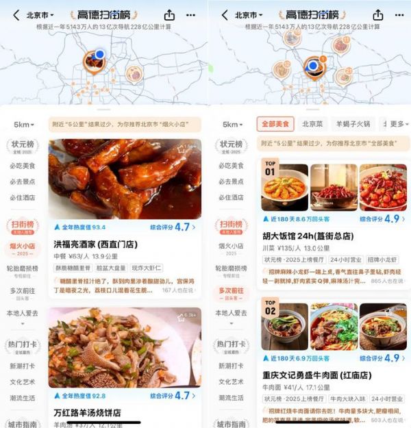 目前,高德扫街榜已经在高德APP上线,榜单包括“状元榜”“扫街榜”“热门打卡”“城市指南”以及多个细分维度,涵盖美食、景点、酒店等多种业态。