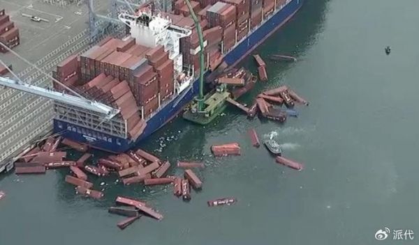 这艘建于2024年、运力为5500标准箱的巨轮在进行卸货作业时突发集装箱堆垛坍塌,约67个集装箱坠入港区水域。