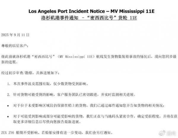 对于此次重大事故,以星方面发布通知称:继此前就洛杉矶港“密西西比号”航线发生货物集装箱事故的情况后,现同步最新进展。