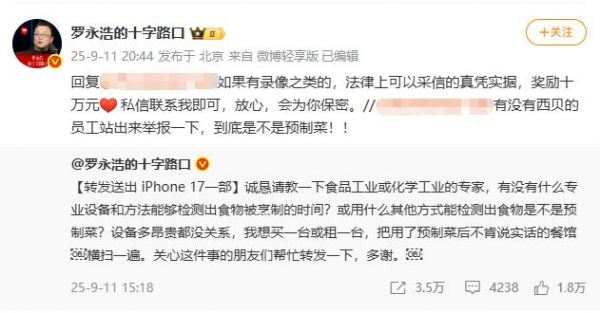 随后,罗永浩还发布10万元悬赏,公开征集西贝使用预制菜的 “真凭实据”。