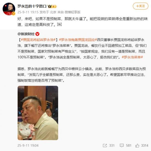 罗永浩24小时连发5条西贝预制菜内容,贾国龙称将起诉