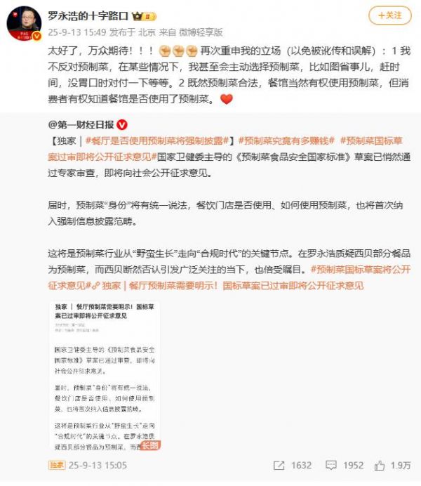 此前,13日下午罗永浩发微博转发第一财经日报报道,配文称:“太好了,万众期待!!! 再次重申我的立场(以免被讹传和误解):1.我不反对预制菜,在某些情况下,我甚至会主动选择预制菜,比如图省事儿,赶时间,没胃口时对付一下等等。2.既然预制菜合法,餐馆当然有权使用预制菜,但消费者有权知道餐馆是否使用了预制菜。”