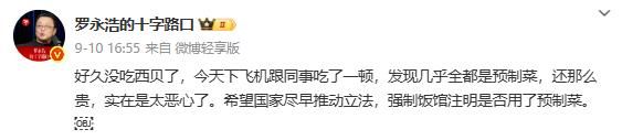9月10日,罗永浩在微博吐槽知名连锁餐饮品牌西贝,称“几乎全是预制菜”。罗永浩表示:好久没吃西贝了,今天下飞机跟同事吃了一顿,发现几乎全都是预制菜,还那么贵,实在是太恶心了。