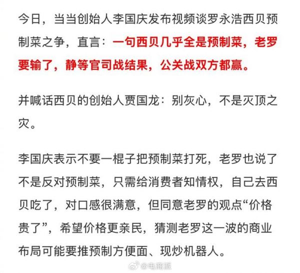 #李国庆称罗永浩会输# 李国庆称罗永浩要输了,因为一句“西贝几乎全是预制菜”,还喊话西贝贾国龙:别灰心不是灭顶之灾。