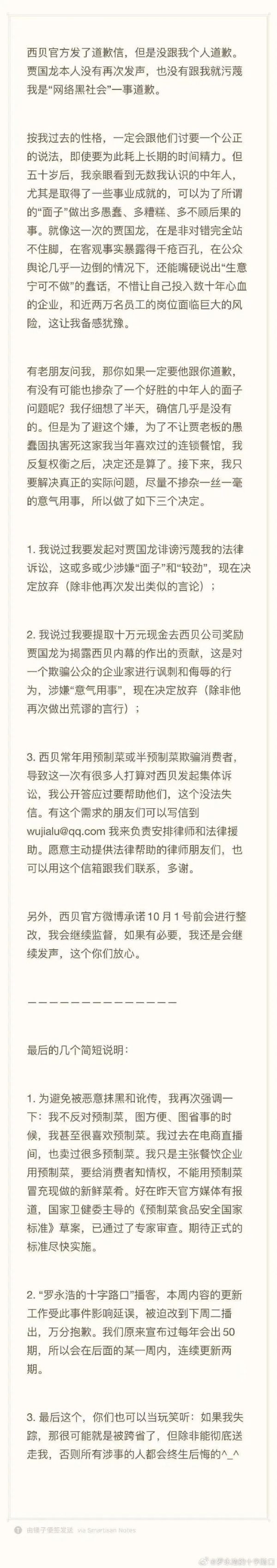 9月15日,罗永浩发文表示,决定放弃进一步追究西贝。