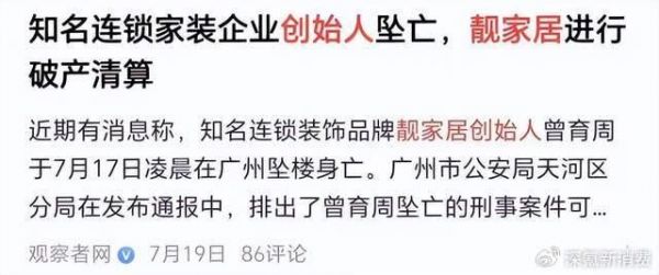 仿佛被拉开的序幕,变故接踵而来。7月17日,靓家居创始人曾育周从高楼一跃而下,终年53岁,他生前最后一条朋友圈还在为门店客流下滑发愁。次日,全国百家门店集体闭店,公司宣布资不抵债、停止经营。
