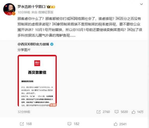 罗永浩发微博吐槽西贝:几乎全是预制菜