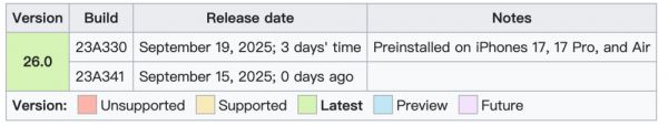 而在9月秋季新品发布会一周后,新一代iPhone 17系列正式开售的三天前,苹果终于敲定了一切,向适配机型全量推送了iOS 26正式版(23A341)升级;至于iPhone 17系列以及iPhone Air手机,则在发售前已经预装了iOS 26正式版(23A330)系统。