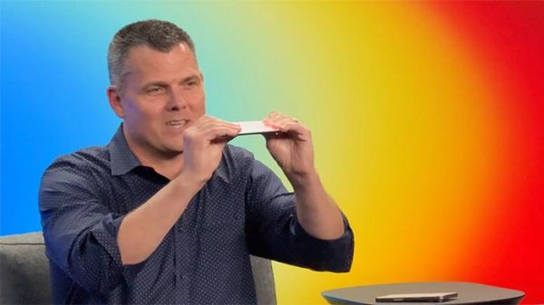 拿到手机后,Lance真的试图用力掰了一下手机,而且是亮着屏掰的,发现并没有什么异常,然后交给了主持人Mark。Mark拿起手机,用“一正一反一正”的方式掰了3下,也没有什么异常,他说:“看起来好像是弯了,但是马上又变直了。”Joz则回复道:“它看起来就像是一个抗震建筑,当你掰的时候它会弯一点,但松手以后它就会恢复原样。”
